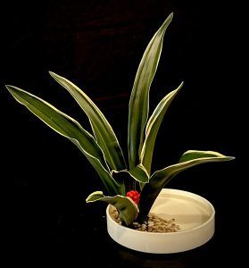 いけ方は自由ですが、前後に開く第一応用花型風にいけ、実(身)囲いの葉を入れると万年青らしくいけられます。